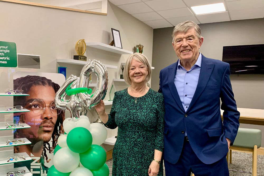 Dame Mary Perkins and Doug Perkins celebrating 40 years of Specsavers at the Guernsey Headquarters in February 2024