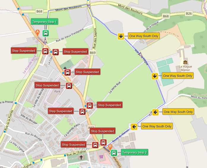 "From Monday 20 October until April 2026, all southbound buses, including school buses, will follow the southbound vehicle diversion route via La Rue de Hague. The maps show where the temporary bus stops will be located."
