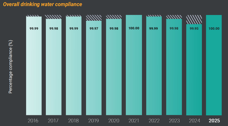 Jersey Water's 2025 water quality report found 100% compliance in all water quality, and no failures for pesticides.